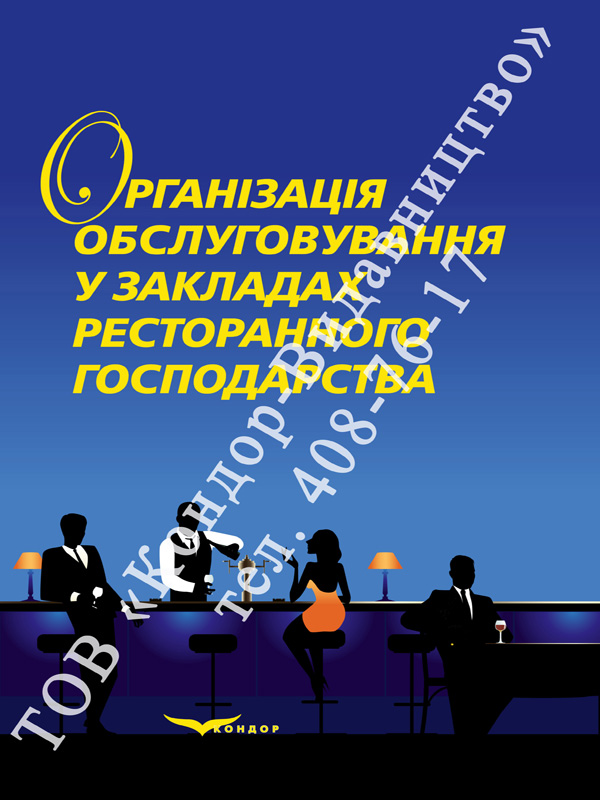 У підручнику розкрита сутність організації процесу обслуговування у закладах ресторанного господарства різних типів і класів. Дана характеристика матеріально-технічної бази як необхідної передумови організації процесу обслуговування. Висвітлені основні правила подавання страв і напоїв, культури їх споживання. Охарактеризовані методи і форми обслуговування споживачів, які використовуються в закладах ресторанного господарства як повсякденно, так і при проведенні бенкетів та прийомів, здійсненні кейтерингового обслуговування, створенні умов для розваг і відпочинку. Розкрито особливості організації процесу обслуговування в ресторанах, барах, кафе, закладах ресторанного господарства при готелях. Визначено основні правила і вимоги при обслуговуванні учасників культурних, громадських, спортивних заходів, іноземних туристів, пасажирів на транспорті, соціально незахищених верств населення тощо.