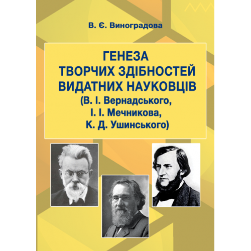 У монографії висвітлені особливості творчого потенціалу та здібностей видатних науковців у онтогенезі, їх зміст, структура на різних вікових етапах у світлі освітніх, виховних завдань, а також суспільних потреб. Розглядаються соціально-економічні та політичні умови, аналізується вплив сім’ї та освітніх установ на розвиток творчих здібностей В. І. Вернадського, І. І. Мечникова, К. Д. Ушинського. Видання має стати у пригоді викладачам вищих навчальних закладів, вчителям, вихователям, а також студентам та аспірантам.
